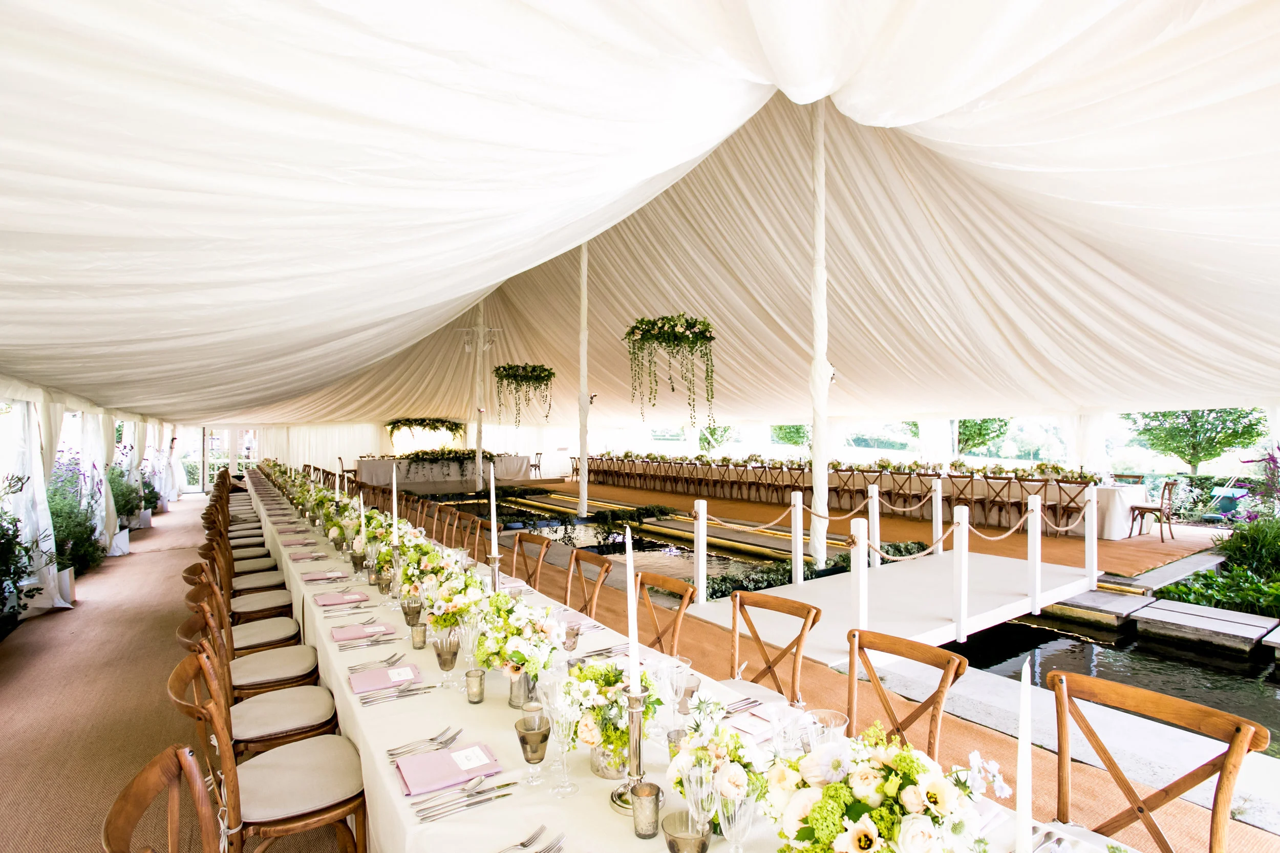 By using a 15m x 24m Pole marquee we were able to create as much useable indoor space as possible to dine 140 guests whilst still leaving an area outside for reception drinks. As the king poles of the marquee need to be installed centrally to the structure our team had no choice but to come up with a way to support them - and the immense weight of the pole tent structure- over the rill, without compromising the event design.